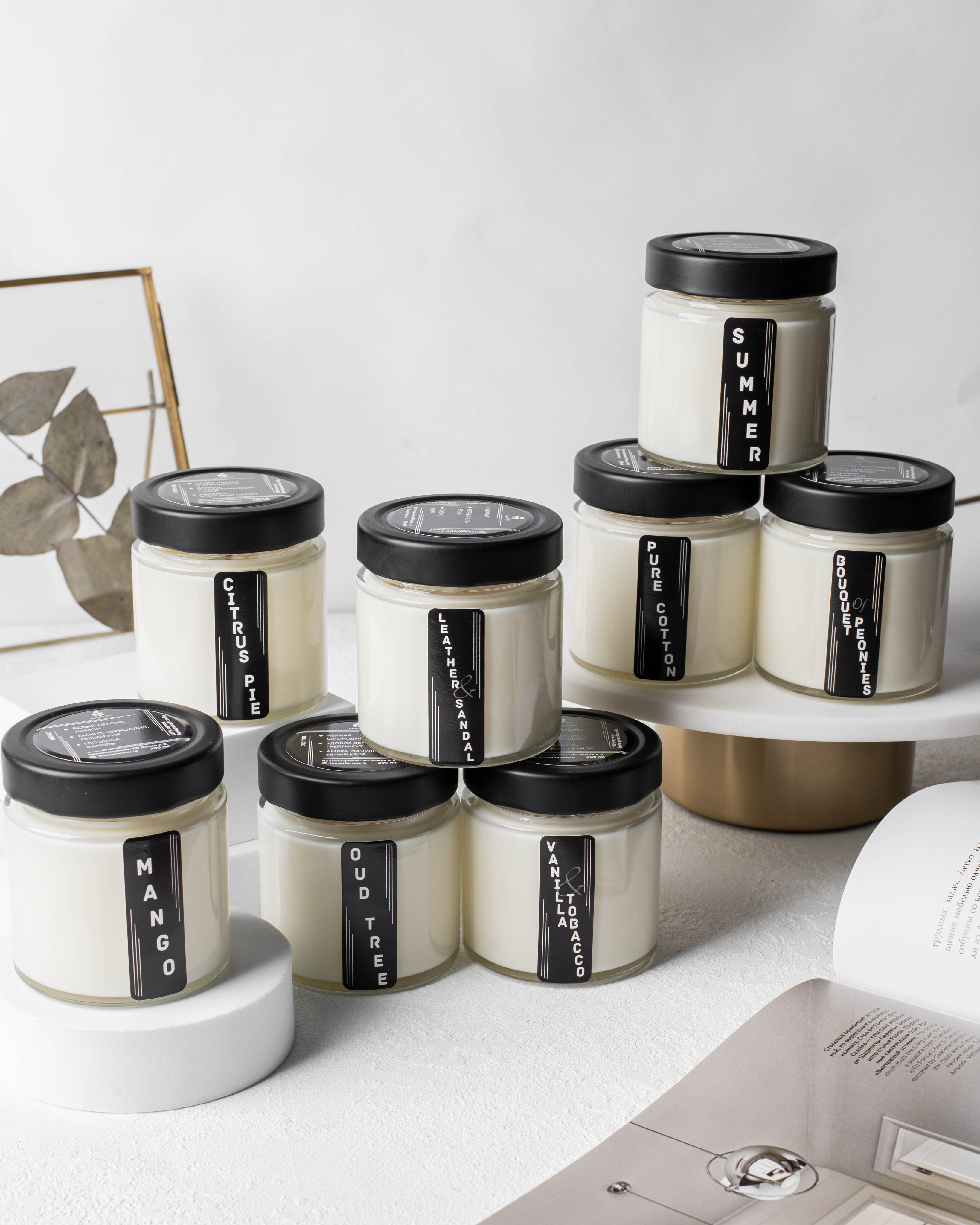 При изготовлении свечей мы используем 100% натуральные компоненты: соевый воск премиум качества (США), хлопковый фитиль (Германия) и стеклянную банку обьемом 200 мл.